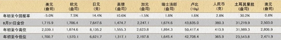 在美联储加息预期不断升温以及美元走强的压制下,金价上周再度下滑,并跌至1700美元/盎司下方,上周五收报1664.7美元/盎司。上个月金价下跌2%,而今年前八个月,以美元计算的金价已下跌5%,而以其他货币[1]计价的黄金表现整体较好,对非美元投资者来说算是一条利好消息(表1)。但总体来看,黄金仍然是今年表现最好的资产之一[2]。