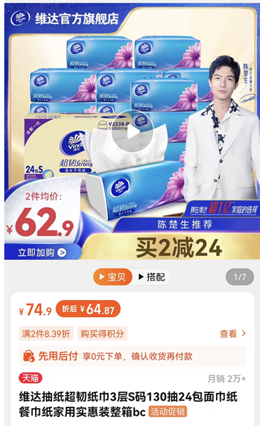 不过,李女士告诉记者,她找到去年的购物记录,发现今年同款的维达抽纸比去年涨价了。去年一箱抽纸59.9元,今年买2箱均价62.9元,如果买一箱64.87元。