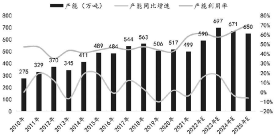 近年来,有机硅、多晶硅消费大幅增长带动我国工业硅快速扩产,产能呈逐年递增趋势。2010—2021年,我国工业硅产能从275万吨上升至499万吨左右(该统计口径不包含再生硅),年复合增长率为5.57%。