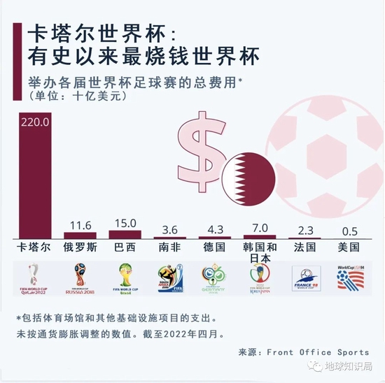 如此富有的国家举办了有史以来最贵的世界杯。对比一下往届,2002年日韩世界杯花了70亿美元,2014年巴西是150亿美元,2018年俄罗斯花了116亿美元。去年东京奥运会花了130亿美元。而这届卡塔尔世界杯花了2290亿美元。之前七届世界杯加起来的总开销是卡塔尔这次的1/5。