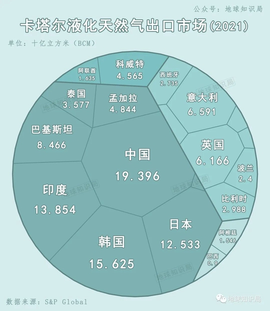 2006年,卡塔尔便超过印尼,成为全球最大的液化天然气出口国。从此,卡塔尔出口天然气不再受到地域的限制,能够将其天量的天然气出口到全世界。目前卡塔尔3/4的天然气出口目的地主要是中国,印度,韩国和日本等亚洲国家。