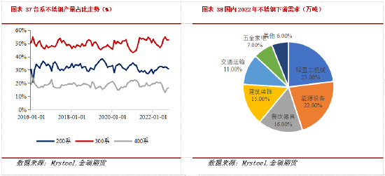 2022年,轻重工机械、能源设备、餐饮器具、建筑装饰、交通运输、五金家电等板块需求占总需求的比例约为23%、22%、16%、15%、11%、7%。随着宏观经济政策导向和居民消费结构等因素的变化,各类下游板块的需求占比也有相应的改变。比如能源行业2019年占比仅为18%,此后几年其发展速度较快,占比逐年增大;而由于房地产开工率的下滑,其附属的建筑装饰板块对不锈钢的需求占比将逐年减小。