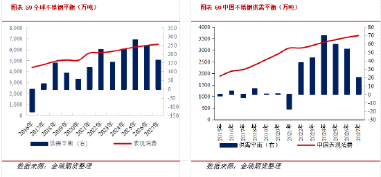 2022年全球受疫情、经济衰退和通胀高企影响,需求持续疲弱,同比减少0.6%,但产量减少更为明显,同比减少4%,预计全球平衡过剩约295万吨,相对前两年有所收窄。2023年全球经济增速预计放缓,不锈钢需求增速预计维持3.6%,随着印尼、中国新增产能释放,韩国产量恢复,全球产量增速预计4%,整体过剩进一步增加约327万吨。