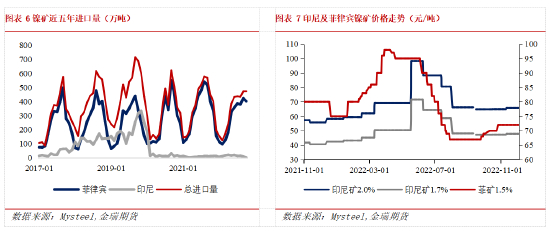 自印尼禁止镍矿出口后,中国镍矿市场供应处于偏紧状态,进口绝大部分来自于菲律宾。2022年1-10月我国镍矿进口3320.5万吨,同比减少11.73%,其中自菲律宾进口2777.9万吨,同比减少18.74%,主要受到传统雨季扰动和印尼镍铁回流导致的减产。截止12月2日,我国主要港口镍矿库存1034.2万吨,约合16.35万金属吨,港口镍矿库存自5月份达到低点后持续累库,整体库存水平贴近去年同期。预计2022年全年我国镍矿进口量同比减少9%,考虑到后续印尼镍铁的持续回流挤压,且印尼镍矿相对于菲律宾镍矿有成本优势,预计2023年中国镍铁产量可能仍将继续下滑,我国镍矿进口量同比仍可能小幅减少。