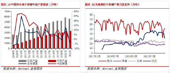 不锈钢供给逐步兑现过剩:2022年全球不锈钢产量预计同比减少4%,受疫情和经济衰退影响,整体产能利用率明显下降。国内不锈钢行业需求下滑,产业利润转亏,钢厂加大检修力度,欧洲受能源危机影响二季度大幅减产,印尼因外需疲弱产能利用、进度均不及预期。而2023年,印尼不锈钢产能仍处于不断攀升阶段,国内不锈钢行业处于产能过剩状态,产量供应弹性较大,欧洲能源危机缓解后产量有所恢复,预计2023年国内不锈钢产量同比增加3%,全球将保持4%产量增速。