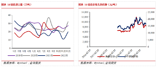 2021年第四季度和今年上半年铬铁均迎来产能投产高峰,叠加电力供应改善,今年铬铁增产较为显著。2022年1-10月我国高碳铬铁产量526.33万吨,同比增加17.24%;1-10月我国进口铬铁202.36万吨,同比下降12.87%。上半年国内铁厂摆脱去年限电限产影响,加之国内铬铁冶炼产能相继投产,铬铁产量大幅增加供给明显过剩,而进口方面叠加南非天气因素扰动下出口受阻和下游钢厂减产情况,使得铬铁进口量较往年大幅下滑。下半年随着不锈钢厂产量明显缩减,对铬铁需求减弱,国内铬铁冶炼利润情况逐渐恶化,生产多有减量,进口环比改善。9月份随着不锈钢生产的逐步恢复,铬铁需求上移,国内冶炼产能利润情况稍好转,铬铁进口有短暂高峰后回落。四季度供给过剩下铬铁厂家仍处于倒挂状态,但铬铁在产厂家多为中大型企业签订长协订单,加之内蒙古地区即将进入冬季,中大型矿热炉停产后较难复产,进一步减产可能较小。