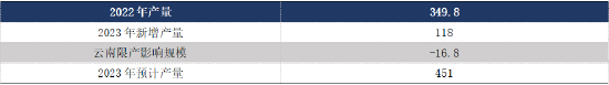 电力供应对产量的影响,主要集中西南水电供应地区的四川和云南省份。进入到2023年,预计异常高温的电力扰动影响不会继续出现,暂时考虑不会影响生产。而西南地区的枯水期水电供应扰动,明年将会继续存在,预计2023年的第一季度单月影响2.2万吨,考虑到23年西南地区新增产能46万吨集中下半年兑现,枯水期明年11月和12月的年内单月减产规模预计有4万吨。