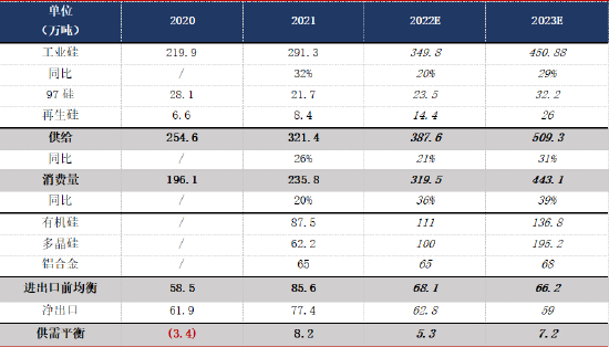 多晶硅过去几年一直供小于求,价格高企,直到2022年供需基本平衡,供给紧缺的情形开始缓解。2023年多晶硅新增规划产能126万吨,在当前多晶硅利润可观的情况下,按照当前的开工率来计算新增产量,2023年约新增耗硅量约95.19万吨,耗硅需求增速95%,对工业硅的总需求约195.16万吨左右。