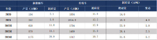 新能源汽车行业在世界各国的产业政策支持下,整体进入发展快车道。在需求和政策的双重驱动下,我国新能源汽车2022年预计650万辆产量,同比增速85%,渗透率也持续提升至30%左右,新能源汽车替代传统燃油车趋势不可逆转。但是,考虑到2023年起上牌的新能源汽车将不再享受补贴,我国新能源汽车产业转入“市场驱动”阶段,可能会压制消费者的需求和影响车企的产量计划,我们认为2023年新能源车预计硅消费量为15.1万吨,同比增加4.1万吨。传统汽车2023年预计硅消费量为11.3万吨,同比减少1.6万吨。总的来说,汽车行业的耗硅量由于新能源车的高增长,2023年耗硅26.4万吨,同比增加2.5万吨/10.5%。