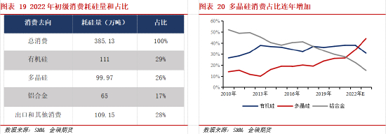 2022年工业硅下游消费量从初级消费进行倒推,合计约385.13万吨的耗硅量,同比去年增加23%,其中各初级下游的耗硅占比如图19所示。