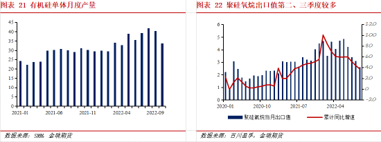 据SMM数据显示,有机硅2022年单体产能594万吨,单体产量(非中间体)425万吨,折合有机硅耗硅111万吨,增幅27%。从图21中可以看出有机硅在第二季度和第三季度对工业硅消费比较景气,主要是受到海外需求的带动,聚硅氧烷出口量增多。后续随着出口量的减少和终端房地产行业的低迷,有机硅产量逐渐下降,开工率下降创下新低,价格不断下跌导致毛利压缩直至倒挂。