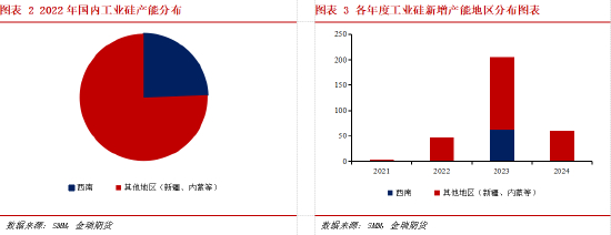 工业硅价格变动在以往具有非常明显的季节性变动趋势,春冬季供给产量减少,夏秋季节供给产量上升。但是这种行情涨跌规律在2022年逐渐弱化,根本原因是因为工业硅新增产能主要位于甘肃新疆和内蒙古等不依赖水电电力供应的区域,西南水电地区的产能产量占比逐渐下降,季节性产量变化不断弱化。