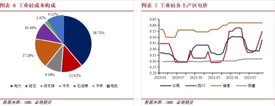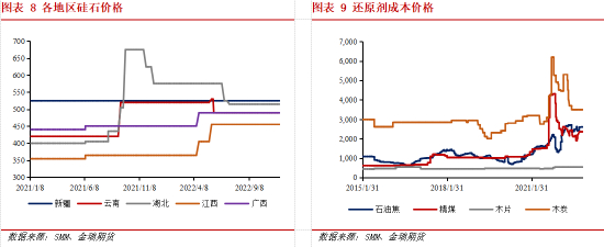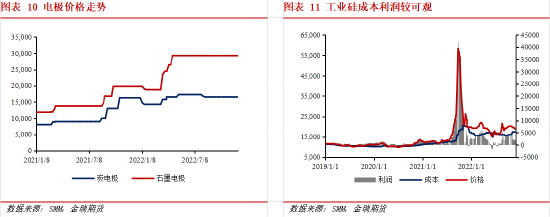 工业硅今年生产成本同比小幅上涨约13%,首先电力成本中新疆电价上涨0.02元/度,云南上涨0.04-0.07元/度,四川上涨0.07-0.2元/度;其次,硅石的价格表现较为平稳,价格波动不大,但是因疫情运输管控问题,部分地区价格小幅抬升;第三,还原剂的价格相比以往几年都有不同程度的上升,其中硅煤今年西北地区的供应在后半年一直较紧缺,价格抬升。石油焦的价格受限于全球能源危机的影响,价格上涨较多。木炭的价格重心也有所上移;最后,石墨电极上涨10500元/吨,价格处于最近几年的相对高位。