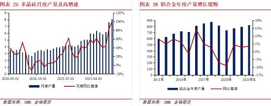 需求同样保持高增速:通过初级行业耗硅量看,22年需求增速达到23%;同样的,无论从初级扩产规模还是光伏、汽车等终端反推,23年需求增速30%,保持高速发展。