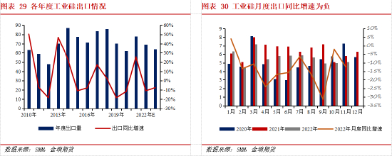 出口情况由于海外需求下降,2022年出口65.6万吨工业硅,同比增速下降15.6%。各个月度同比增速均为负,出口情况较为低迷。