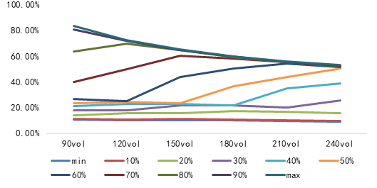 工业硅期权首批上市SI2308、SI2309、SI2310、SI2311和SI2312系列期权合约,其中SI2308合约是7月初到期,距离上市首日超过6个月,应采用120日历史波动率进行分析。工业硅现货120日历史波动率目前是19.37%。工业硅现货120日历史波动率中位数23%,运行区间大致在15.93%——65.34%之间。当前,工业硅现货120日历史波动率位于历史30%-40%分位值之间,处于历史偏低水平。