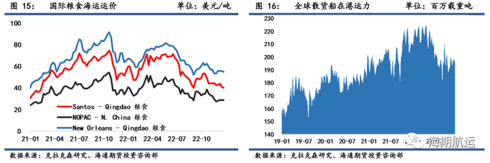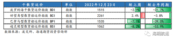 运力方面,由于国外圣诞假日来临,船运活动趋于平静,本期全球在港运力总体有所回落。运价总体来看,大型散货船运指BCI在年末因供应紧凑而迎来一波小高潮,但大概率不会继续持续,下期运价在双旦节假日影响下,判断可能相对弱势。