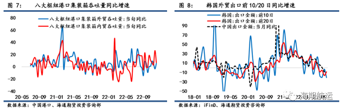 贸易需求端:外贸先导数据韩国前20日出口金额同比增速在12月上中旬继续录得负值,12月前20出口金额同比下跌8.8%,较上月的-16.7%有所收敛,但依然处于收缩区间,体现了亚洲主要产成品出口国在外需疲弱的背景下出口活动进一步放缓。该数据与中国外贸出口数据趋势吻合度较高,因此进一步印证了中国集装箱出口活动的孱弱。美国经济数据方面,11月核心PCE物价指数继续趋缓,同比增长4.7%,略高于市场预测的4.6%;耐用品订单环比下降2.1%,降幅超出市场预期,进一步体现了美国经济趋缓的迹象;居民通胀预期也回落至18个月以来的最低水平。美国进口数据方面,美东港口吞吐量逐步下降,上个月进口箱量下降9.7%;美西港口跌幅更甚,下降26%。总体来看美国前十大港口在11月的集装箱进口箱量大幅下降17.5%,已经是连续第三个月同比快速下跌。