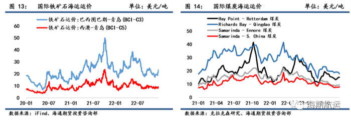 铁矿石方面,本期运价总体呈先强后弱趋势,周三录得周内最高值,其中BCI- C3巴西图巴朗-青岛航线运费录得23.22美金/吨,为10月中旬以来的最高值,周内均值录得22.25美金/吨,环比上涨12.08%;BCI-C5西澳-青岛航线运费录得周内最高值9.10美金/吨,为10月下旬来的最高值,周内均值录得8.47美金/吨,环比上涨1.50%。近期得益于四大矿山季末冲量,铁矿国际贸易的货盘集中释放,海运运需有明显提高,对即期运力有所消耗,运费也有较大涨幅,冲高至同期高位;但下半周随圣诞假期临近,市场火热气氛趋于平静,运费快回落。国内贸易需求端则变化不大,预期距离明显改善仍需时日。总体看,在外矿发货热潮后叠加圣诞假期来临,市场情绪降温属正常现象,运费自然回落,后市判断短期运价将震荡偏弱。