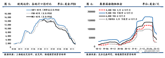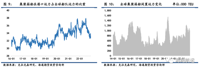 即期市场的低迷情绪进一步蔓延至了租船市场,一艘9000TEU的节能型集装箱船一年期期租租金环比上周持平在71000美金/天;平均租约时长仅为5.5个月,较峰值时期的16.2个月出现明显下滑,体现船公司在中长期市场表现的悲观预期下不愿意以当前的租金水平锁定长租约。