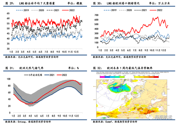 LNG船运费连降4周后,本周出现企稳。但在全球气候预计偏暖背景下,市场对当前欧洲胀库风险和亚欧天然气消费整体放缓而减少运力需求表现出一定的担忧。中国LNG消费需求多以项目船绑定,对即期运力需求偏低。欧洲天然气总需求降幅远远超过了欧盟所设定的减少15%目标(11月天然气消耗量同比下跌了24%)。12月22日欧洲正式批准将天然气价格上限定为每兆瓦时180欧元,将于2023年2月15日生效,这或将降低发货国发货运至欧洲的积极性(如若亚洲给出的价格更高),对欧洲LNG船抵港需求有限制作用,但仍需观望实际落地效果。短期来看,目前中国疫情感染拖累现货需求,而欧洲下周天气转暖或将对LNG船运力需求起到抑制作用。