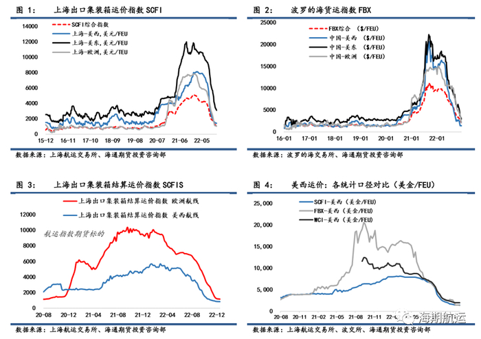 本周SCFI综合指数环比下跌1.4%至1107.09,美西航线运价继续保持微跌,环比上周仅下滑0.4%,录得1418美金/FEU;欧线运价继上周小幅回暖后本周转跌,但跌幅仅为0.1%,录得1049美金/TEU,基本确定底部位置。美东运价跌幅较为明显,环比上周下降2.3%至3096美金/FEU。货代运价指标FBX本周环比持平,细分航线运价出现分化,首先是欧线运价暴涨10.9%至2405美金/FEU,但同样需要关注回暖的可持续性,预计较差,底部基本确认。美线方面,美东航线运价跌幅明显大于美西航线,分别环比下跌10.1%和2.7%,和船东端运价走势基本一致。受到美西码头劳资谈判的影响,越来越多的货物转移至美东港口,前期美东运价积累了明显涨幅。因此在需求明显转淡的背景下,美东航线运价回撤幅度也更甚美西。