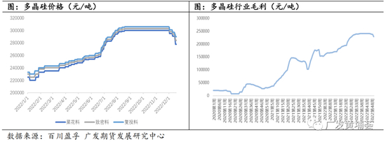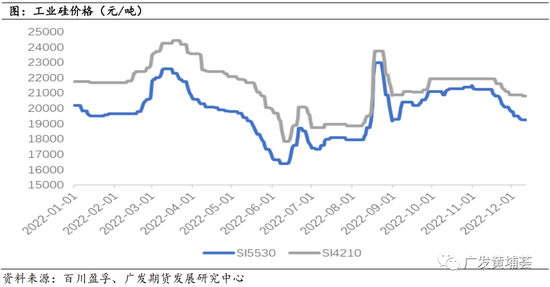 四季度,新疆和四川地区开始陆续复工,但受疫情管制影响,复产节奏较慢,原材料运输成本上升,生产成本增加,云南地区亦传来限电减产消息 ,同时多晶硅有新增产能爬坡或投放,增加对工业硅需求,工业硅价格小幅上涨后企稳。11月开始,疫情管控逐步放开,之前新疆地区囤积的货物开始流通,行业库存整体保持高位,下游需求疲软,工业硅价格缓慢下跌,截止12月11日,通氧Si5530价格19250元/吨,Si4210价格20800元吨。
