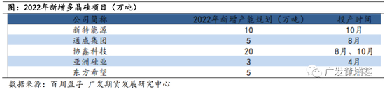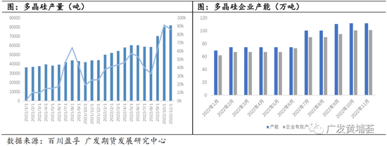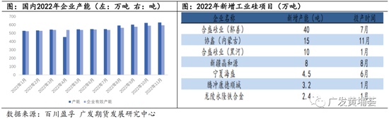 2022年工业硅产能的增长主要来源于停产产能复产和新增产能。根据百川盈孚统计,截止今年11月份国内工业硅企业产能628.6万吨,较年初增加100.5万吨,同比增长19.03%,其中部分是之前停产产能复产所增加的,如合盛黑河10万吨项目复产等,而新增产能项目中体量较大的为合盛东部鄯善40万吨项目,还有协鑫内蒙古15万吨项目。