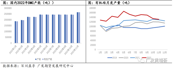 产量方面看,全年有机硅供应充裕。截至11月份国内有机硅DMC共生产156.75万吨,同比增长20.86%,以每吨有机硅DMC消耗0.58吨来计算,新增工业硅需求15.677万吨。从月度产量来看,受上半年新增产能投放较多,1-5月产量稳定增长。随后6-7月受疫情影响及需求疲软,个别企业停车检修,产量出现减少。8月工业硅价格上涨,企业有推涨欲望,月产量环比增加6000吨,但实际下游消费依旧疲软无明显起色,DMC价格短暂反弹后一路下行,企业成本倒挂,同时企业库存压力较大,企业停产检修增加来调节生产节奏来控制库存,月产量减少,11月有机硅生产131300吨,较年内月产量最高的5月份减少35000吨。预计今年共生产有机硅170.35万吨,折工业硅需求98.8万吨。
