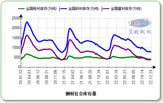 第三阶段:(11月2日-12月底)震荡反弹。11月份以来,在稳增长政策持续加力、美联储加息放缓、钢铁产量下降、供给端压力有所缓解、社会库存持续下降等因素带动下,国内钢铁市场震荡反弹。截至2022年12月底,兰格钢铁综合钢材价格指数为4337元/吨,较11月1日低点上涨268元/吨,涨幅为6.6%。