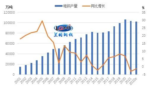 2023年,中国钢铁行业仍面临产能减量置换的推进、以及低碳发展、极致能效推进的双重约束,粗钢产量将小幅下降,兰格钢铁研究中心预计2023年粗钢产量将在10.1亿吨,同比波动幅度在1.0%左右。