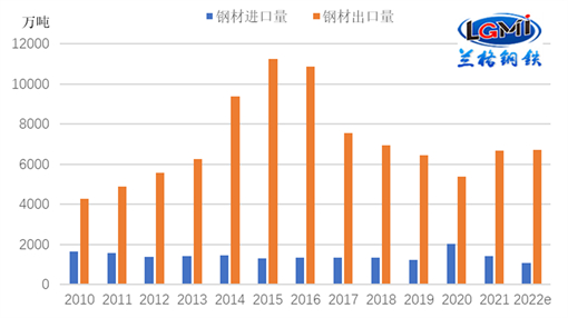 2022年,在俄乌冲突及其引发的地缘政治格局演变影响下,俄罗斯、乌克兰、欧盟和欧洲其他国家钢铁生产持续受到较大制约,中国以外的地区钢铁产量的持续下滑,叠加中国钢铁出口供应链稳定、价格相对优势,海外订单指数阶段性好转,使得钢材出口保持韧性。海关统计数据显示,2022年1-11月,我国累计出口钢材6194.8万吨,同比增长0.4%;累计进口钢材986.7万吨,同比下降25.6%;同期中国净出口钢材5207.0万吨,同比增长7.1%。预计2022年中国钢材出口在6700万吨左右,同比保持持平或小幅增长态势;钢材进口1100万吨以内,同比下降25%左右(详见图5)。