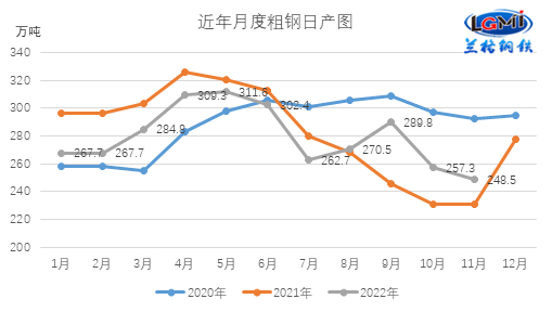 就粗钢日产水平来看,年度日产略有下降,2022年1-11月粗钢平均日产280.0万吨,较2021年全年平均日产283.0万吨减少了3.0万吨,下降1.1%;月度日产在2022年5月份创年内最高水平,为311.6万吨(详见图3),较2021年4月历史最高记录326.2万吨减少14.6万吨。