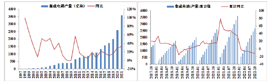 我国集成电路行业在政策支持下快速发展,2010-2019年均增速高达15%。2020及2021年我国集成电路累计生产分别同比增长29.45%及33.3%。2022年1-9月我国集成电路累计产量同比下滑10.8%。9月集成电路产量为261.4亿块,同比下滑16.4%。今年以来的疫情影响以及全球范围的供应链扰动,使得集成电路产量出现了较为明显的下滑。随着疫情影响未来逐渐淡化,集成电路产量还将有望恢复正增长。