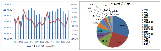 美国地质调查局USGS数据显示,2021年全球锡矿产量为30万吨,较2020年增长13.64%,一改此前连续两年的下降。主要因为2021年高锡价刺激锡矿山加快生产,印尼、中国、秘鲁、刚果等多国产量均有增长。对于2022年,国际锡协预计全球锡矿新增产能仅650吨,不过在产矿山产量增长明显,印尼及刚果矿山将贡献主要增量,印尼与私营冶炼厂相关的矿山生产将恢复到正常水平,刚果金Alphamin矿品位回升,带动产量增长。