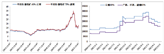 今年以来,锡精矿价格跟随锡价高位回落,但是加工费还是一路走高,直到7月份炼厂大规模检修时才开启了下行走势。截止11月3日广西、江西、湖南地区60%锡精矿加工费均价15000元/吨。云南地区40%锡精矿加工费均价19000元/吨。