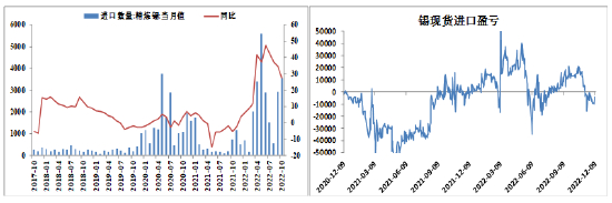 另外,2022年以来我国精练锡进口窗口多数时间打开。但是在进入6月份之后,进口窗口就呈现关闭态势了,并且一直延续至8月份,进口窗口才逐渐重新开启。最新数据显示,我国9月进口精练锡2937.06吨,环比8月增加了2373.13吨,也验证了9月份以后进口窗口打开的效果。由于内强外弱的情况还在持续,未来到2022年底,还将延续进口窗口打开的状态。