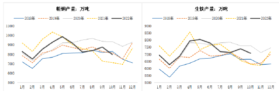 螺纹钢产量相比过去几年下了一个台阶。据Mysteel数据,2022年螺纹钢周产量最高值为311万吨,截止11月,全年周产量最低值为230万吨,同口径下过去3年螺纹钢周产量最高为400万吨,包括春节期间在内最低为240万吨,2022年螺纹产量均值相比去年下降13%,较2020年下降20%。利润回落是产量下降的主要因素,春节过后高炉生铁产量回升,同比相差并不多,同期钢厂利润已降至历史低位,盈利水平快速回落,螺纹产量也相应下降,钢厂在利润回落后先行减少了废钢用量。据Mysteel数据,今年3-5月样本钢厂废钢消耗量同比减少30%,进入7月份,钢企利润虽有回升,但废钢用量并未随铁水产量同步增加,3-10月国内钢厂废钢消耗量同比下降32%。今年1-10月生铁产量同比减少717万吨,与粗钢产量降幅相差930万吨,明显高于2021年1-10月,废钢用量下降贡献了绝大多数粗钢产量下降。