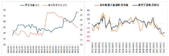 图4-3:央行调研居民储蓄和购房支出情况 图4-4:房企购置土地面积及新开工面积