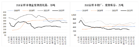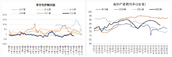 今年政策实际影响不大,但供应端受利润影响比较大,螺纹钢高炉生产利润相比2021年均值减少300元/吨,在二季度价格见顶回落后,钢厂利润也大幅下滑,全国247家样本钢厂盈利占比由70%以上最低降至不足10%,并在50%以下持续了8周时间,同期高炉产量大幅下降,粗钢日均产量由二季度的300万吨降至7-8月260-270万吨,7月下旬钢厂利润低位反弹,盈利占比升至50%以上,但进入10月份,随着钢价下跌,利润又再次下降,钢厂盈利占比在10月中旬开始降至50%以下并一直持续至11月,10月份粗钢日均产量再度降至257万吨。下半年以来,高炉一直维持低利润状态,电炉方面则长期亏损,电炉企业的开工率在二季度回落后,一直未能回到上半年的水平,电炉产量明显下降。