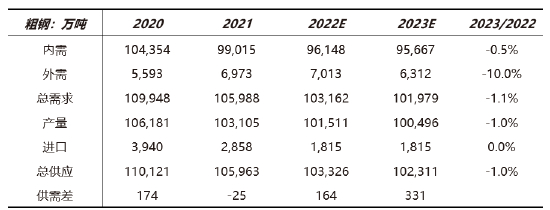 2022年粗钢国内消费量同比预计减少3%,2023年地产好转,但基建、汽车、家电增速可能回落,因此粗钢内需有所好转但仍小幅下降0.5%,外需在欧美经济开始走弱及海外钢材价格跌至2020年中后,预计下降10%,粗钢总消费量减少1.1%。供应方面,2022年粗钢产量预计减少1600万吨,1.5%,2023年若无政策性减产任务,粗钢产量预计跟随需求波动,初步估计减产1000万吨,降幅1%,粗钢供需情况相比2022年宽松,但宽松幅度未显著放大。