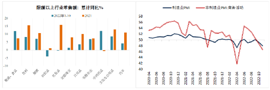 图6-1:中国限额以上行业消费品零售额增速 图6-2:中国制造业和非制造业PMI