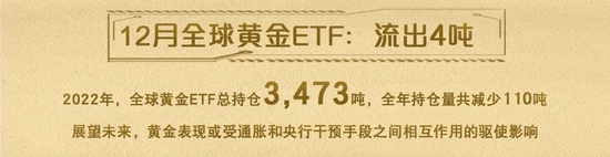 2022年12月,全球黄金ETF已连续八个月需求为负,全球持仓减少4吨(约合5.34亿美元)。但由于该月金价上涨了3%,黄金ETF流出/负需求的速度继续放缓[7]。
