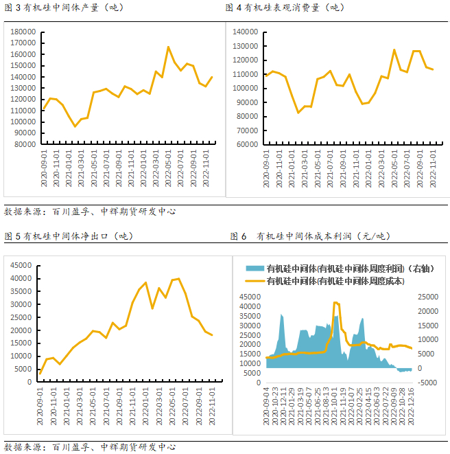 根据百川盈孚统计,2022年有机硅中间体产量约170.70万吨,同比增加20.56%。6月份有机硅中间体产量16.63万吨,下半年有机硅中间体产量开始一路走低,截至12月,有机硅月产量13.95万吨。从表观消费量来看,下半年有机硅中间体表观消费量基本与上半年持平,但总体仍处于走低趋势。从成本利润来看,有机硅中间体成本总体稳定,从9月份开始逐渐亏损,进而拖累有机硅产量。2022年国内有机硅消费波动较大,同比2021年虽然有增加,但是自8月份开始进入下行通道。