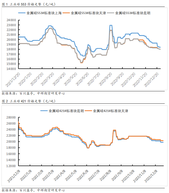 10月份以后,有机硅单体利润开始大幅走低,有机硅厂家减产,工业硅需求走弱。此时工业硅产量仍然保持在高位,工业硅工厂库存一路累积。截至2022年12月16日,工业硅工厂库存10.34万吨,而10月初工厂库存仅8.26万吨,累计增幅25.17%。至此工业硅价格开启下跌通道。11月以后,西南地区枯水期电价有所提升,叠加还原剂价格走高,工业硅成本开始再次走高,截至2022年12月16日,工业硅综合成本达到17917元/吨,成本的不断抬升在一定程度上延缓了工业硅价格下跌速度。