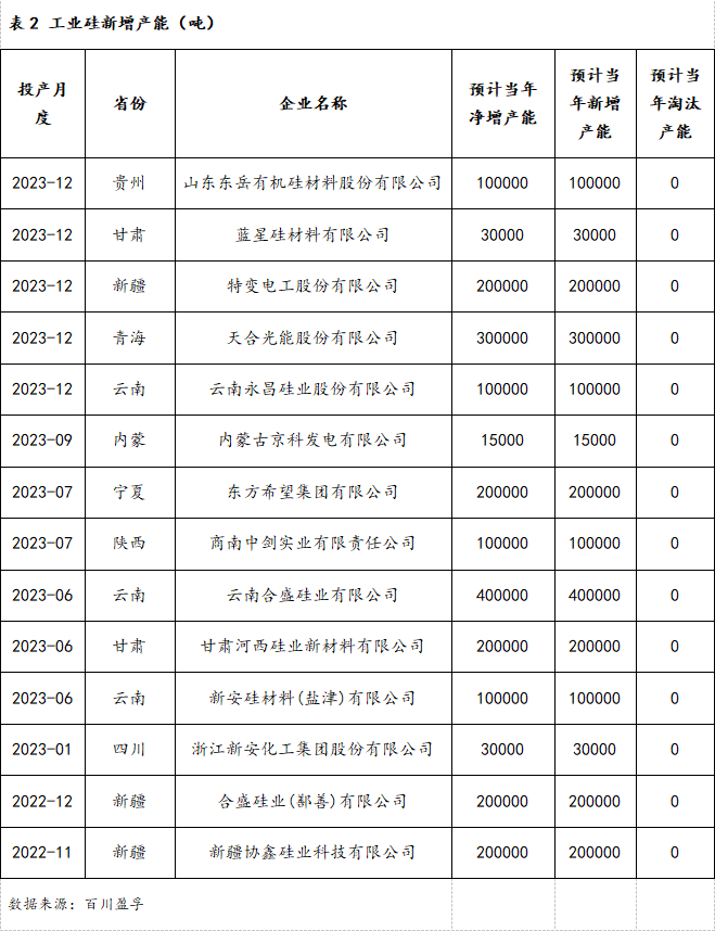 需求方面:随着疫情管控的放开,终端消费提升,将带动有机硅需求增加。全球经济低迷会导致有机硅出口量将维持低位。房地产行业随着政策的推进将逐渐改善,有机硅终端需求有望修复。新能源汽车行业的蓬勃发展将使得我国汽车行业在外贸市场份额进一步增加,汽车行业景气度的提升进一步增加铝合金需求。多晶硅行业2023年将迎来转折,产能爆发、行业竞争加剧,多晶硅利润将持续回落。但多晶硅行业高固定资产投资比例以及行业竞争白热化将使得新增产能如期投产。预计2023年多晶硅新增产能100万吨,并主要集中在三季度,三季度新增产能将达到74万吨,对应工业硅需求增量78.8万吨。