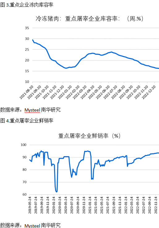 从生猪目前价格来看已经处于较低的位置,叠加屠宰企业库容率的低位,部分屠宰企业开始分割冻品入库,但春节假期后终端环节仍以消化节前储备的家庭库存为主,需求较弱下导致鲜销率也会较低,企业或存在被动入库现象 ,同时生猪价格在节后传统消费淡季也难有起色,对于屠企来说原料成本较低,叠加对未来需求好转的预期,一定的利润刺激屠宰企业入库。因此我们预测在2月之后屠宰企业将持续增加冻品入库量,此时对猪价会有一定支撑。