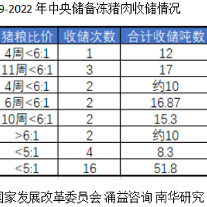 国家发改委1月9日消息显示,据监测,1月3日~6日,全国平均猪粮比价为5.93∶1,已经进入过度下跌三级预警,那么收储是否已经接近?猪价是否就要止跌企稳了呢?别急,在回答之前,我们不妨先来回顾下历史。随着2009年《防止生猪价格过度下跌调控预案(暂行)》的印发,截止到目前我国一共实施了8轮的收储,为此我们对每轮收储所处的猪粮比、收储的次数与吨数做了如下的统计,我们发现在较早年份,国家一般在猪粮比下跌进入二级预警后就启动了收储,而从近两年来看,猪粮比只有进入到下跌一级预警后,收储才开始启动,且收储次数明显有所增长。
