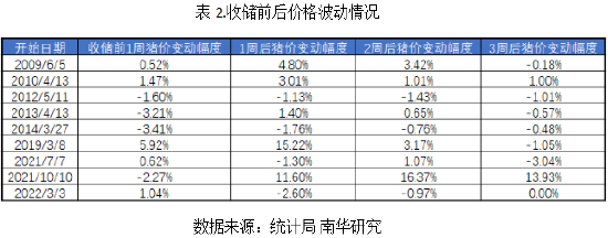 那么收储如果启动,价格又会有什么变化呢? 从表1中我们可以发现,往年每次收储量基本在10-20万吨,相比每年市场上整体供应的猪肉量来看,可谓“小巫见大巫”。因此其对价格的影响更多的来自于提振人们的预期,在情绪上遏制养殖户的恐慌,放缓出栏速度,通过影响市场的预期从而在短期内影响猪价,其本身并不能改变生猪价格的长期趋势,长期仍得看生猪的供需基本面情况。从表2收储政策开启前后价格波动情况来看,也证实了这一点,在收储政策开启后的一周时间里,价格都较上周有所回升,具体表现为涨幅较上周更大或跌幅较上周更为缓和,而随后的几周价格又开始回到原本的趋势中。其中比较特殊的是2022年,这是由于去年收储采取了多次少量的方式,在3.3第一次收储开启后,3.10又进行了下一轮的收储,对价格施加了新的“推力”,使得猪价跌幅有持续减缓的效果,但由于基本面的供需情况并没有什么改变,这时候往往跌势不改,直到四五月份,生猪供应产能的去化开始,这时候收储政策的实施起到了“四两拨千斤”的效果,带动价格止跌企稳,开始上涨。因此,对价格的影响,收储政策时机的施放也至关重要。