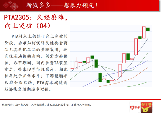 基本面概述:供需方面偏多,春节期间,国内多套TA装置重启,带来TA季节性累库,相比往年处于正常水平;下游聚酯年后将全面启动,PTA需求端随着经济恢复预期逐步增强。
